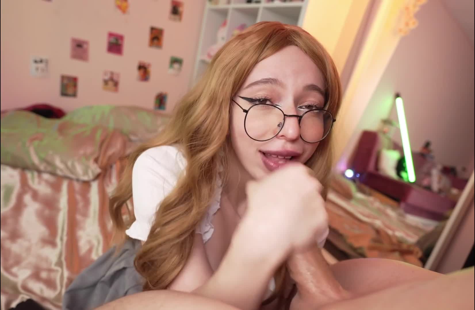 Рыжеволосая бабёнка старательно и умело делает минет мужу.