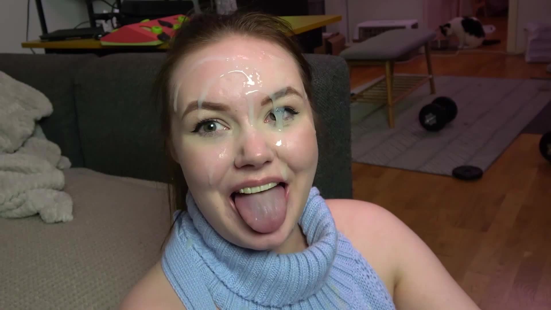 Получила порцию спермы на своё милое личико.