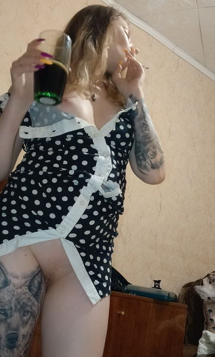 Хороша шалава! Судя по тату ей нужен крупный кобель с большим узлом;)