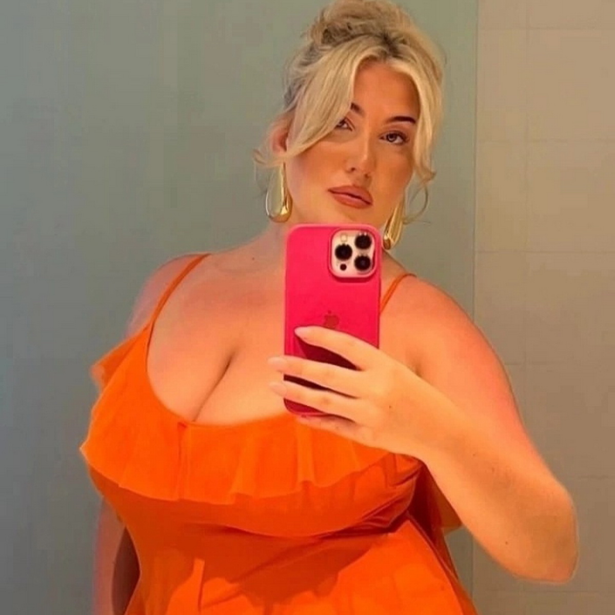 Красивая дама с пышной грудью снимает себя на телефон.