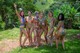 веселая компания нудистов развлекается боди-артом в поездке на тропический остров