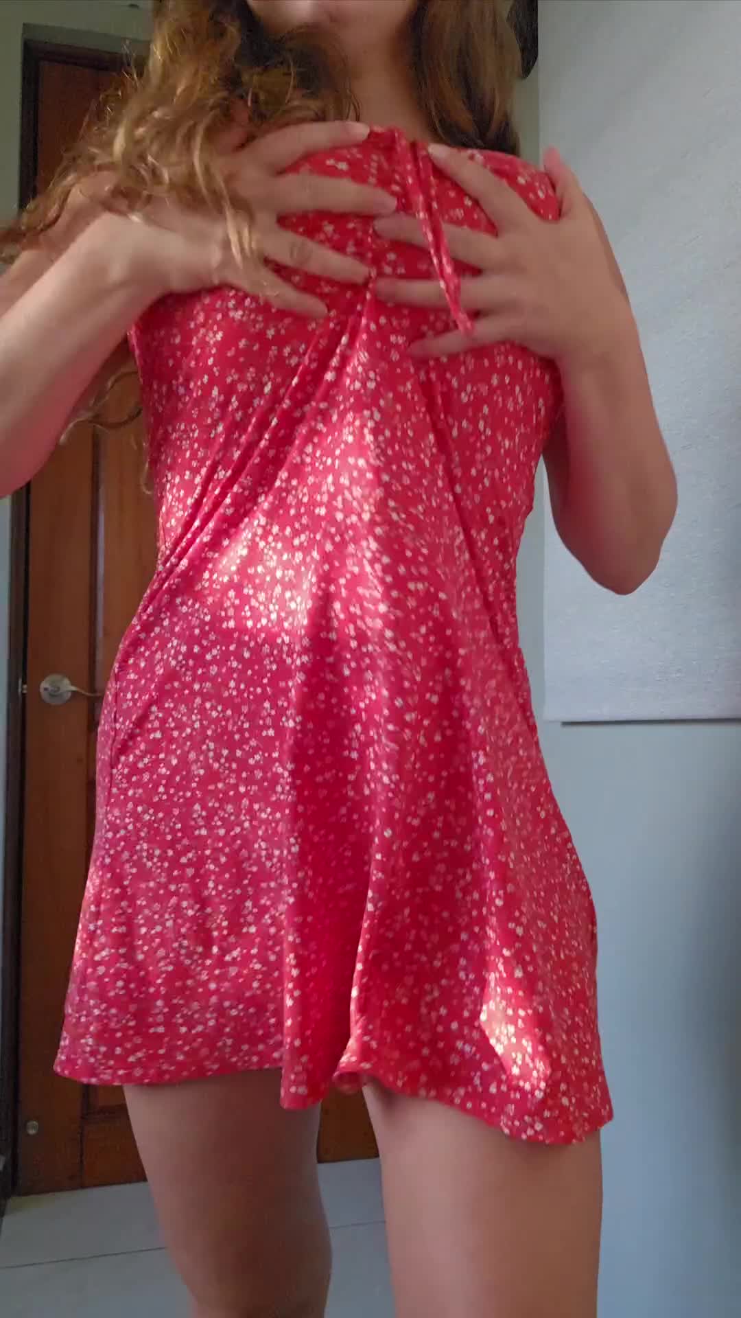 Тёлочка с ярком сарафане показывает идеальные упругие сиськи.