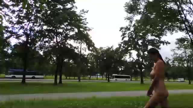 Голая девушка ходит по скверу