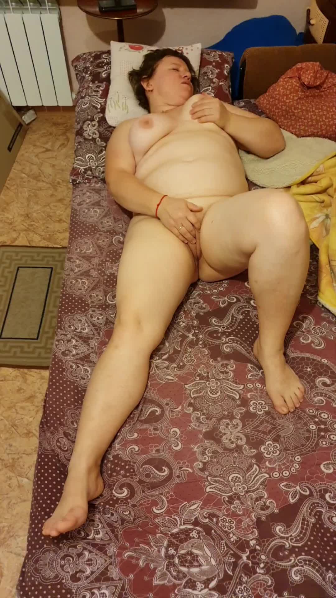 Пышная супруга, раскинув ноги, релаксирует перед камерой мужа