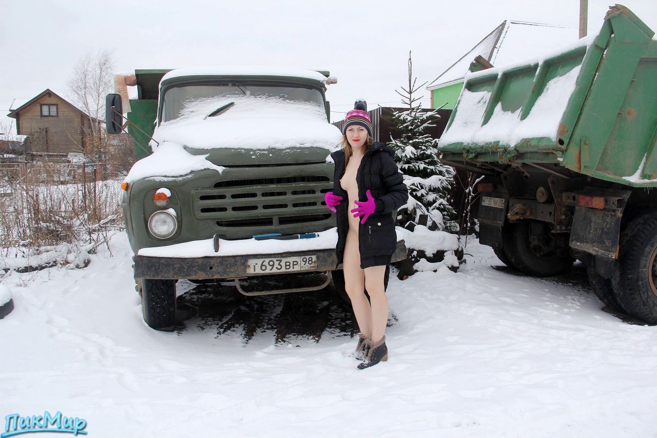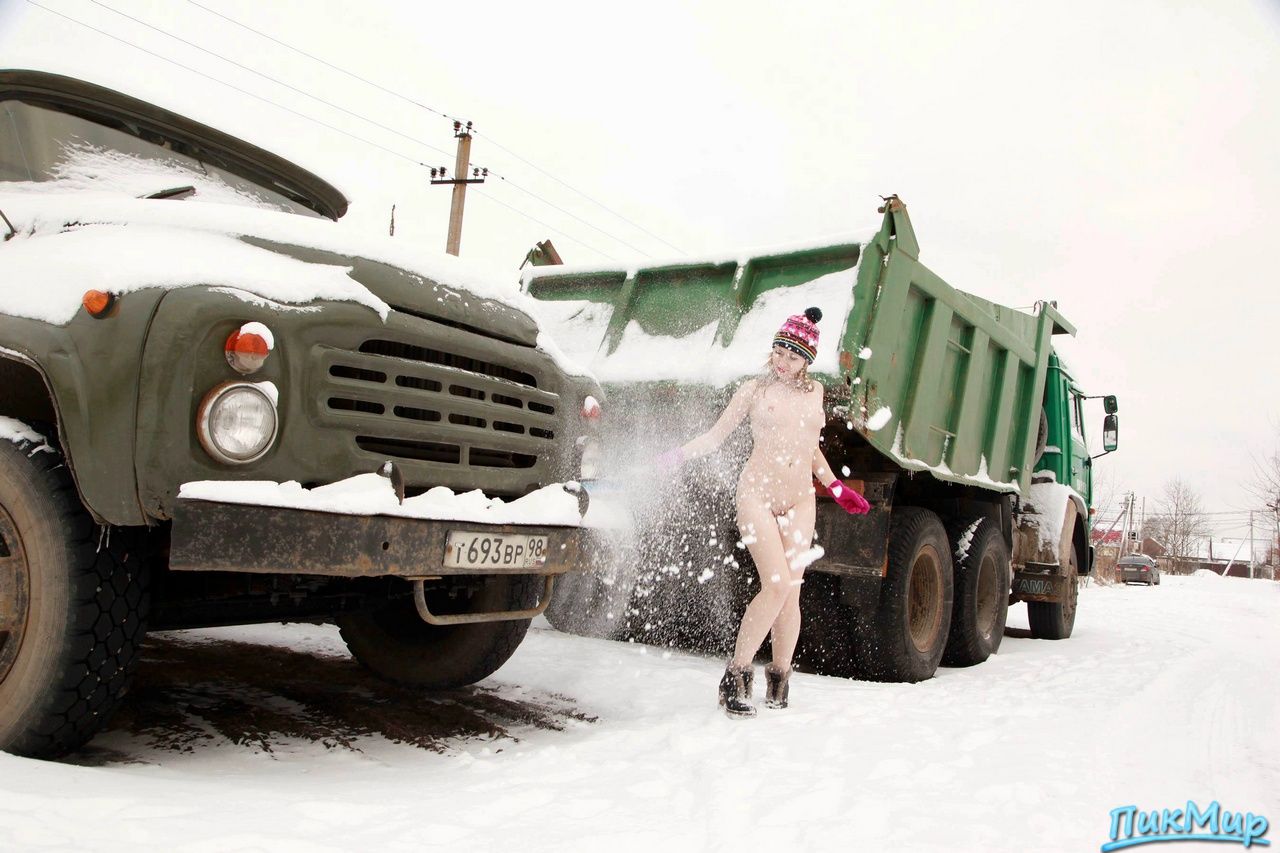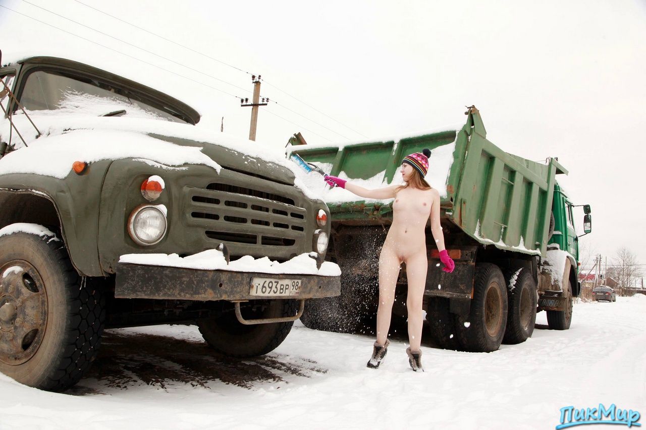 Молодуха позирует и убирает снег со старого советского автомобиля