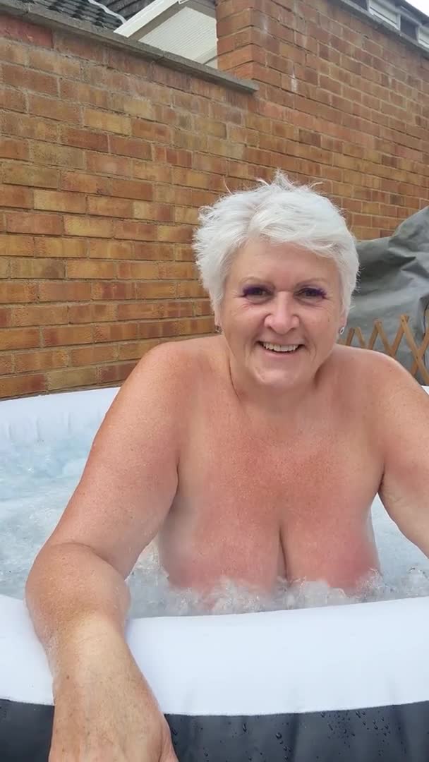 Седая женщина отдыхает обнаженной в джакузи за своим домом.