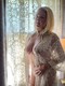 В белой прозрачной накидке. Она смотрится эротично. Да и вообще, похоже, грудью своей очень гордится, потому и украшает её.