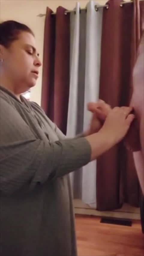 Пышная зрелая женщина сосет большой член парня под Новый год и получает финал на грудь!