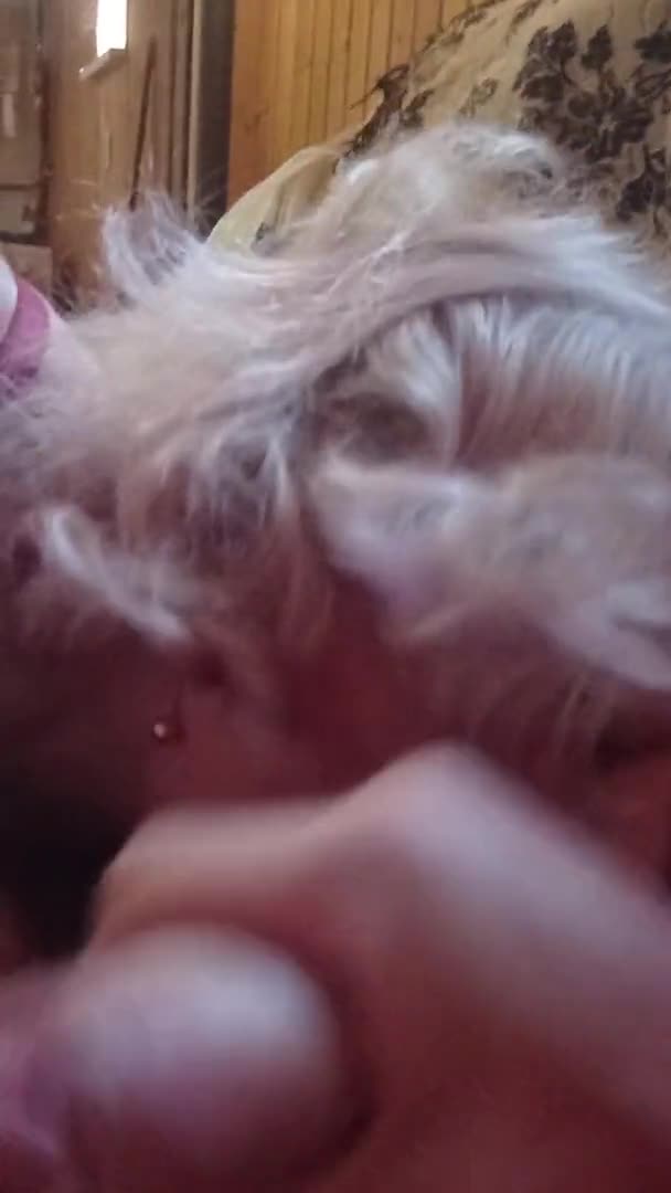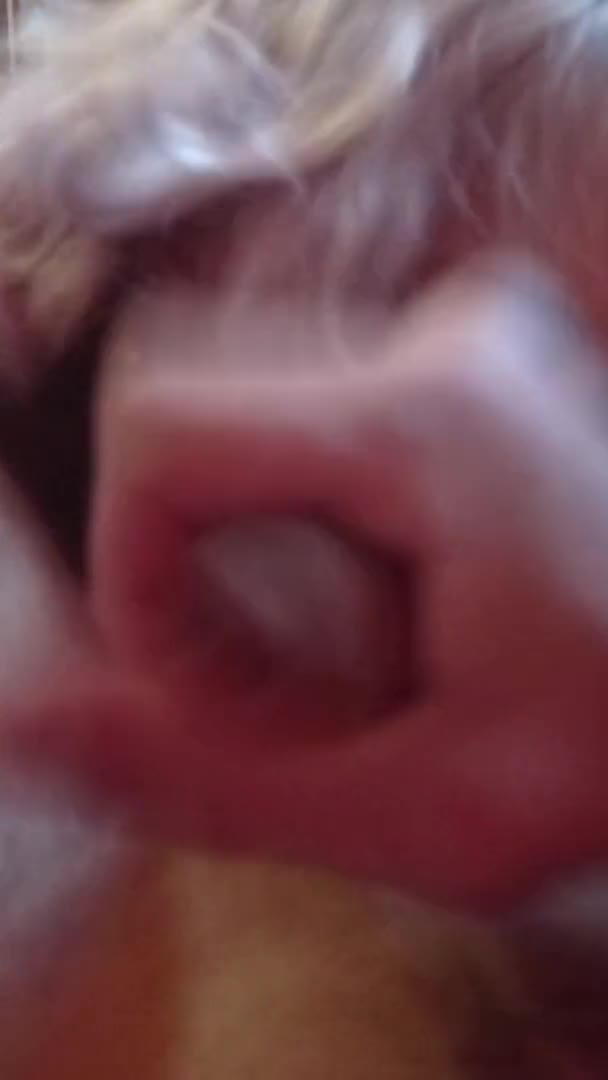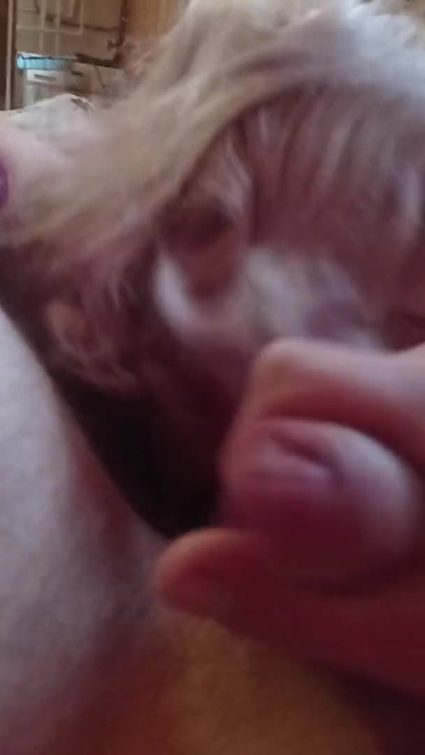 Зрелая блондинка на камеру сосет член и вылизывает яички мужчине!