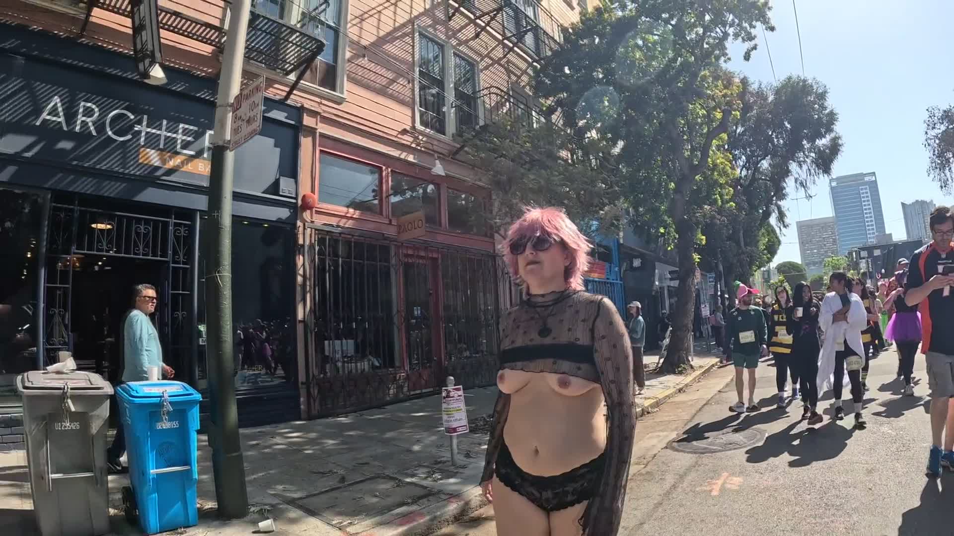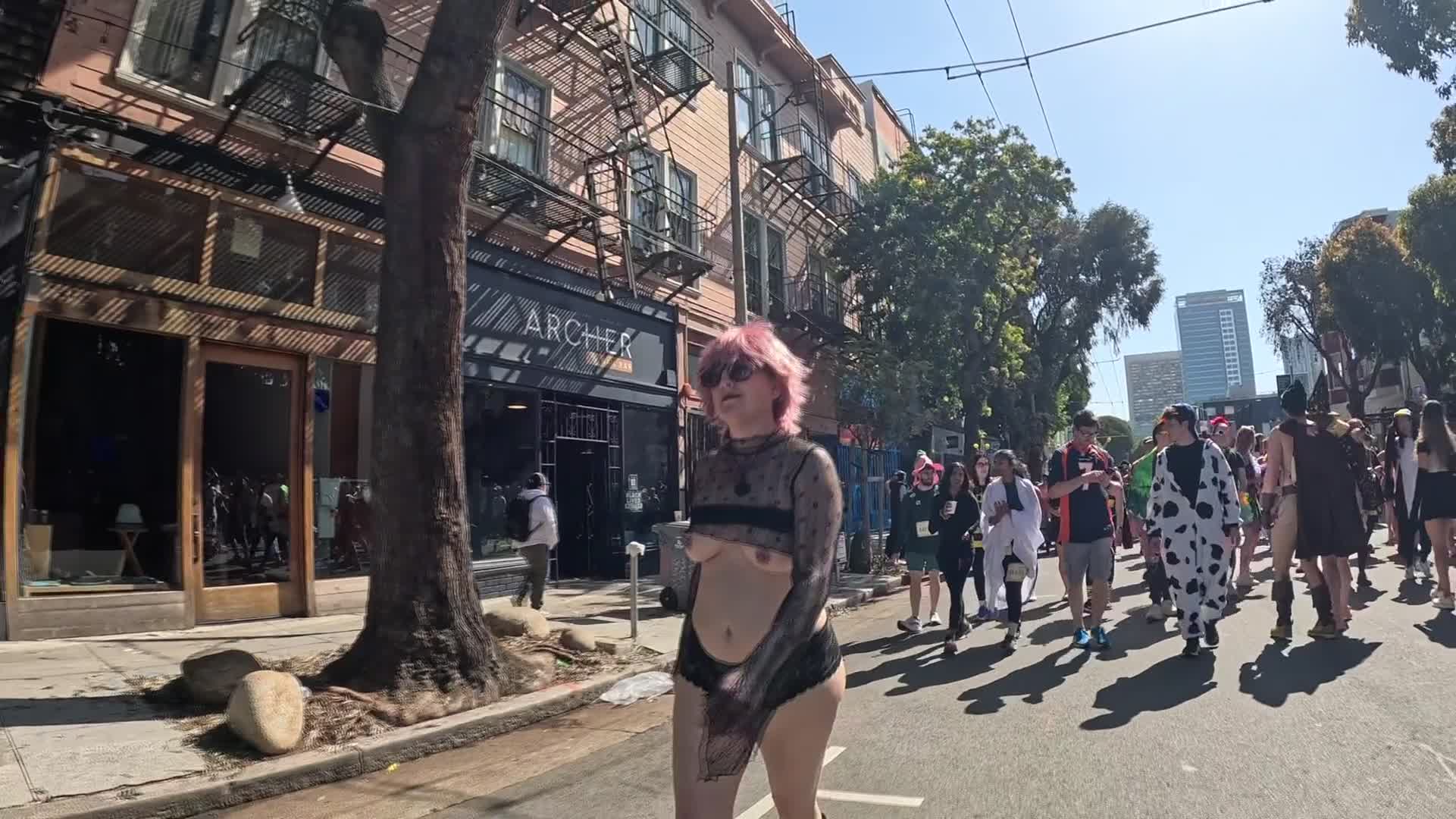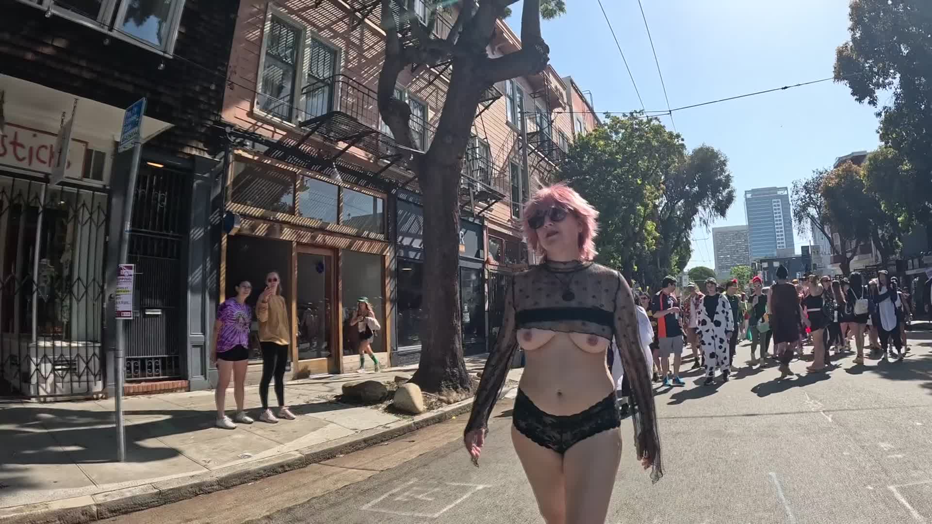 Женщина идет с обнаженной грудью по многолюдной улице.