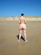 взрослая милашка отдыхает голышом на пляже и позирует на фотокамеру.