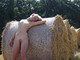 Свеже собранный урожай в собран и голенькая Сашенька позирует на стогах сена