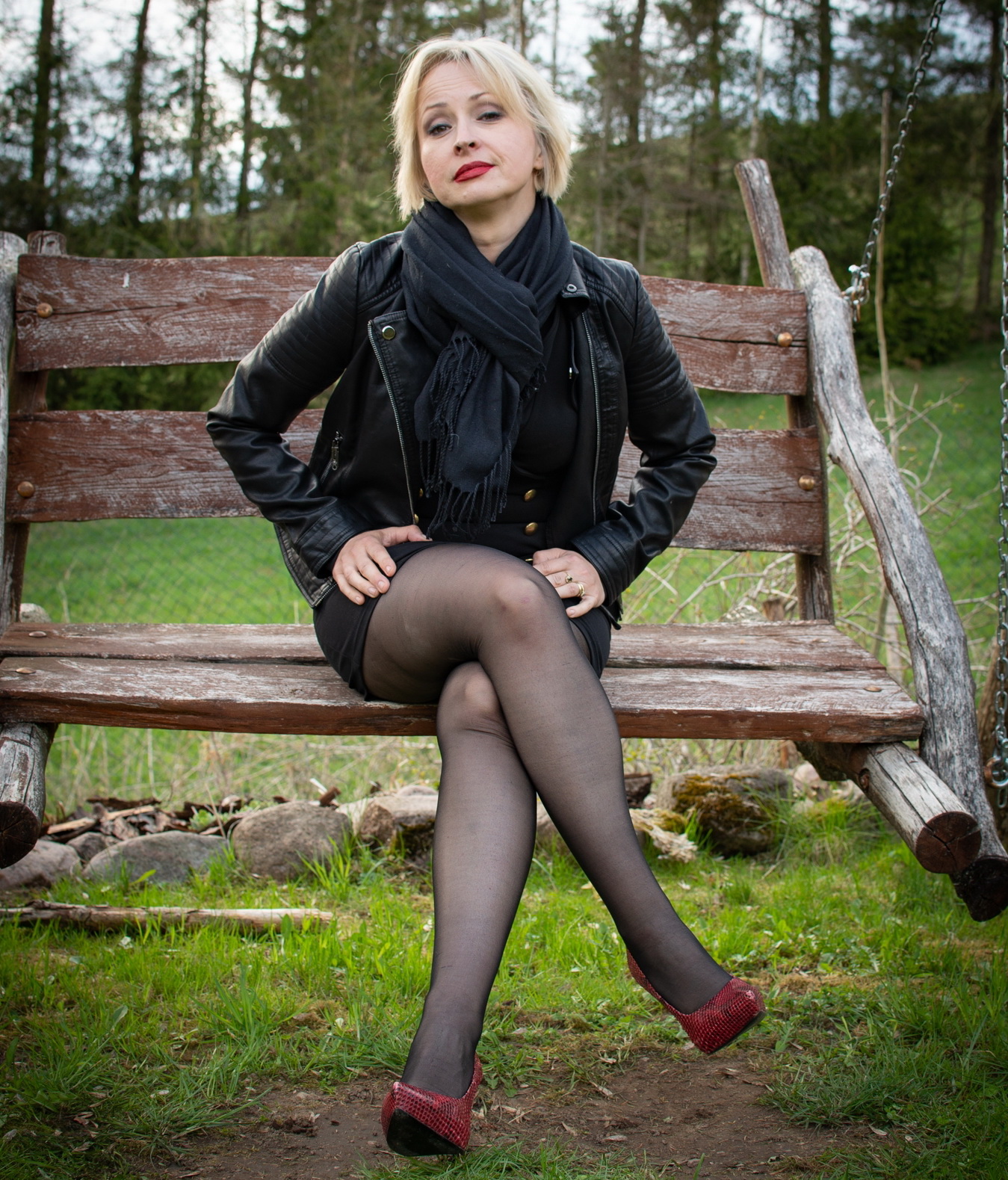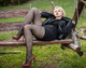 Зрелая блондинка в осеннем лесу на скамейке показывает как сексуально она выглядит в её возрасте.