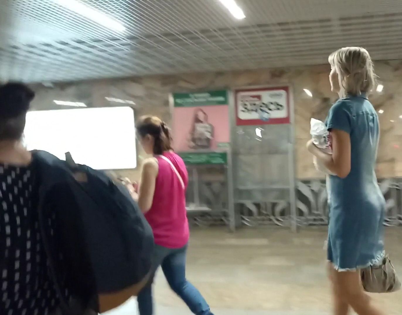 Симпатичную девушку в джинсовом платье попалили в метро, сняв на скрытую камеру её симпатичную мохнатку под платьем прямо на эскалаторе. Сперва может показаться, что трусиков нет, но они есть, только очень эротично прячутся в лохматке. Приятного просмотра!