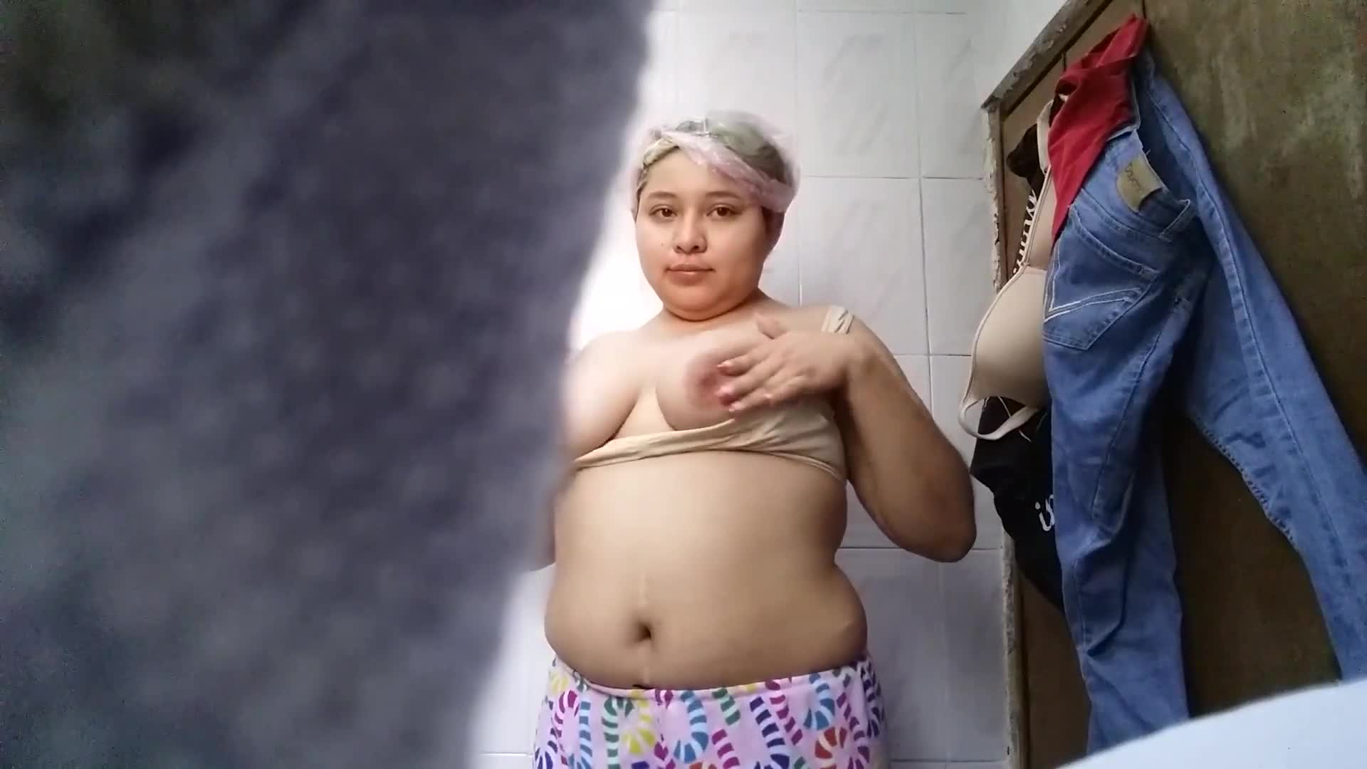 Не очень привлекательная и полная девушка демонстрирует, что её грудь всё ещё упругая и ждёт ласки.
