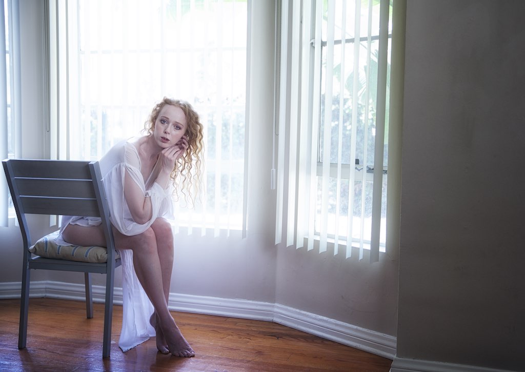 Красивая девушка с нежной, воздушной внешностью и рыжими волосами.