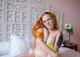 Слегка полненькая девушка с цветной прядью волос обнажается на кровати демонстрируя хорошенькое тело