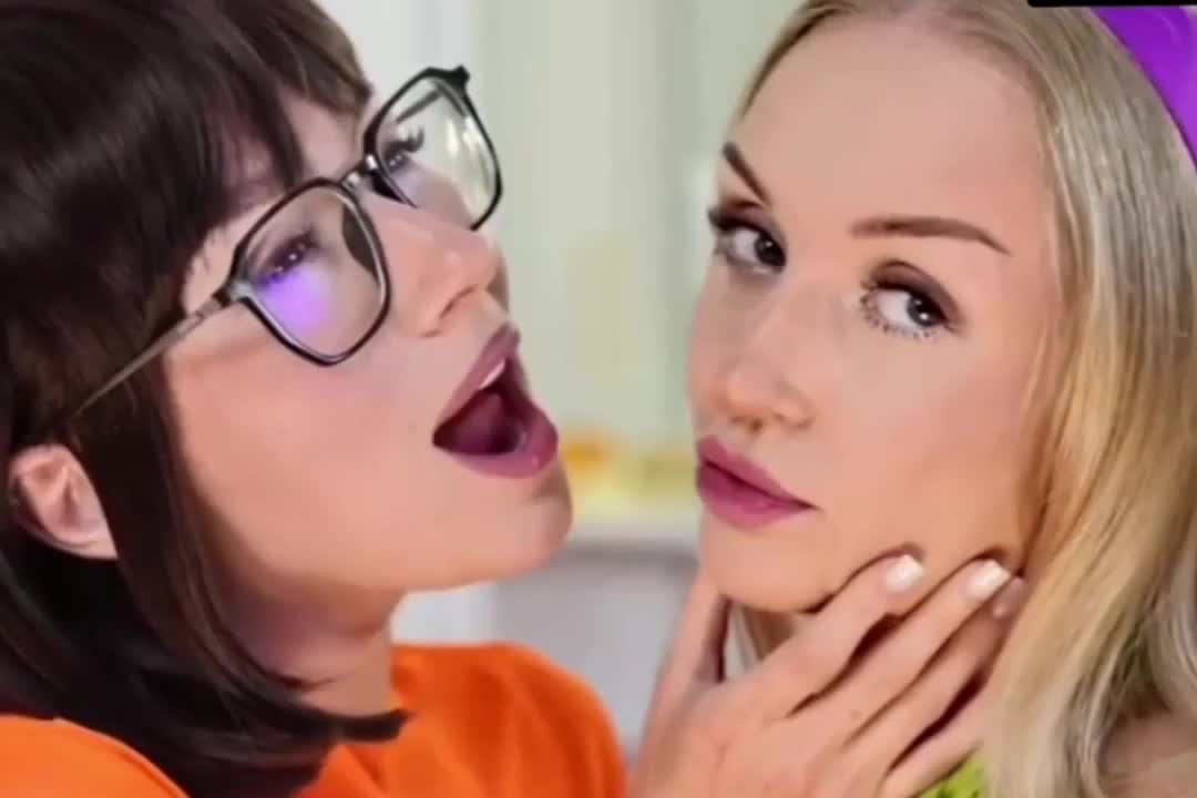Две девушки, похожие на персонажей из мультфильма «Скуби-Ду», целуются друг с другом оригинально и страстно.
