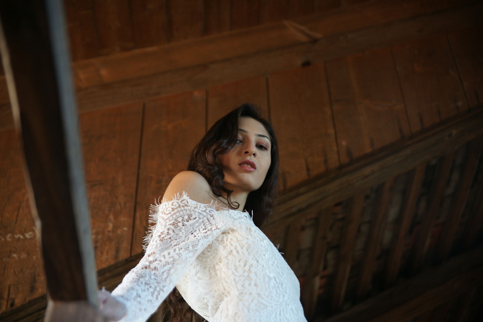 Эротическая фотосессия очаровательной брюнетки в старой деревянной мельнице.