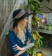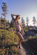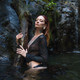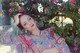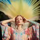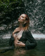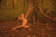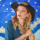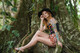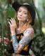 Красивая девушка со сказочными татуировками позирует на природе.