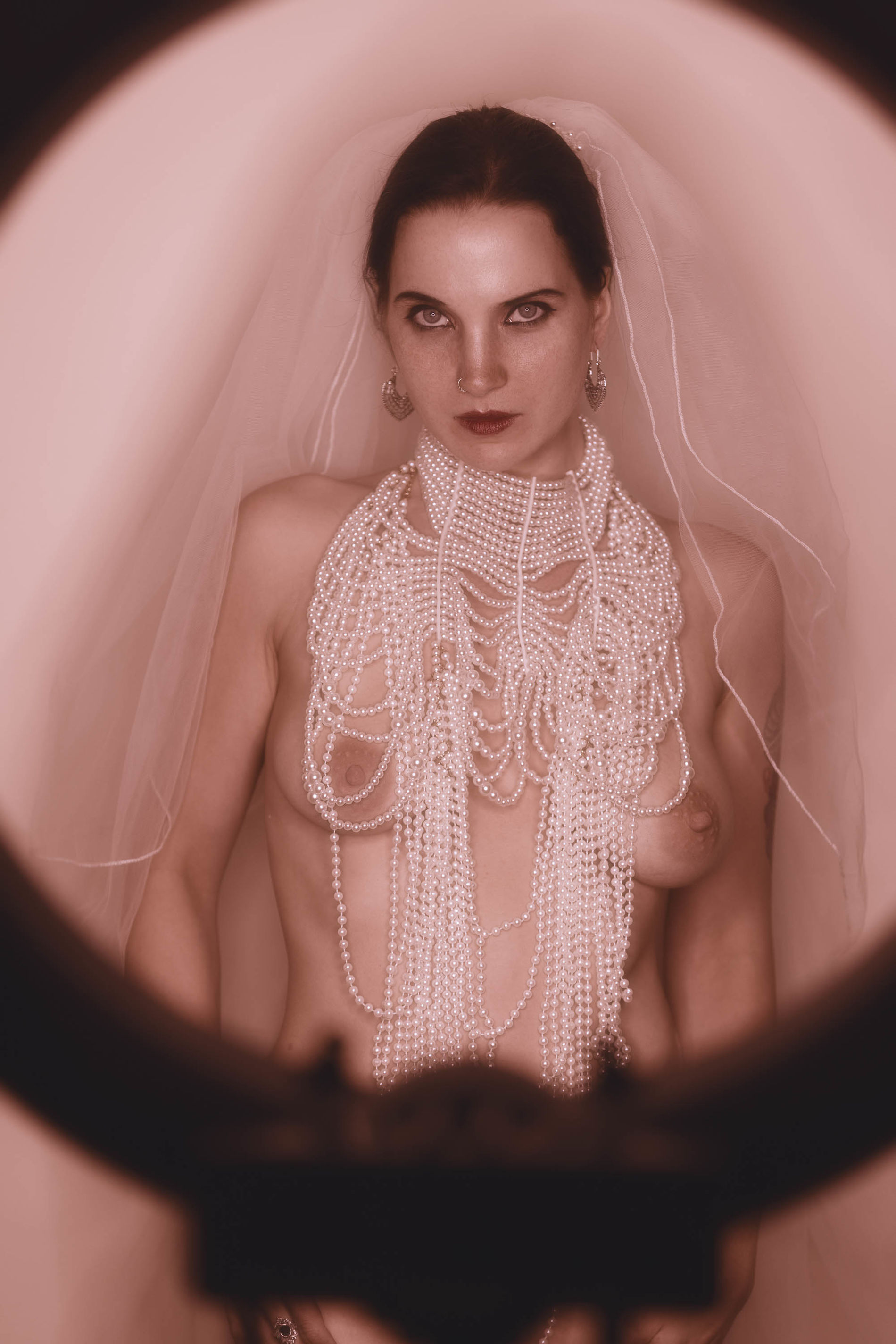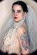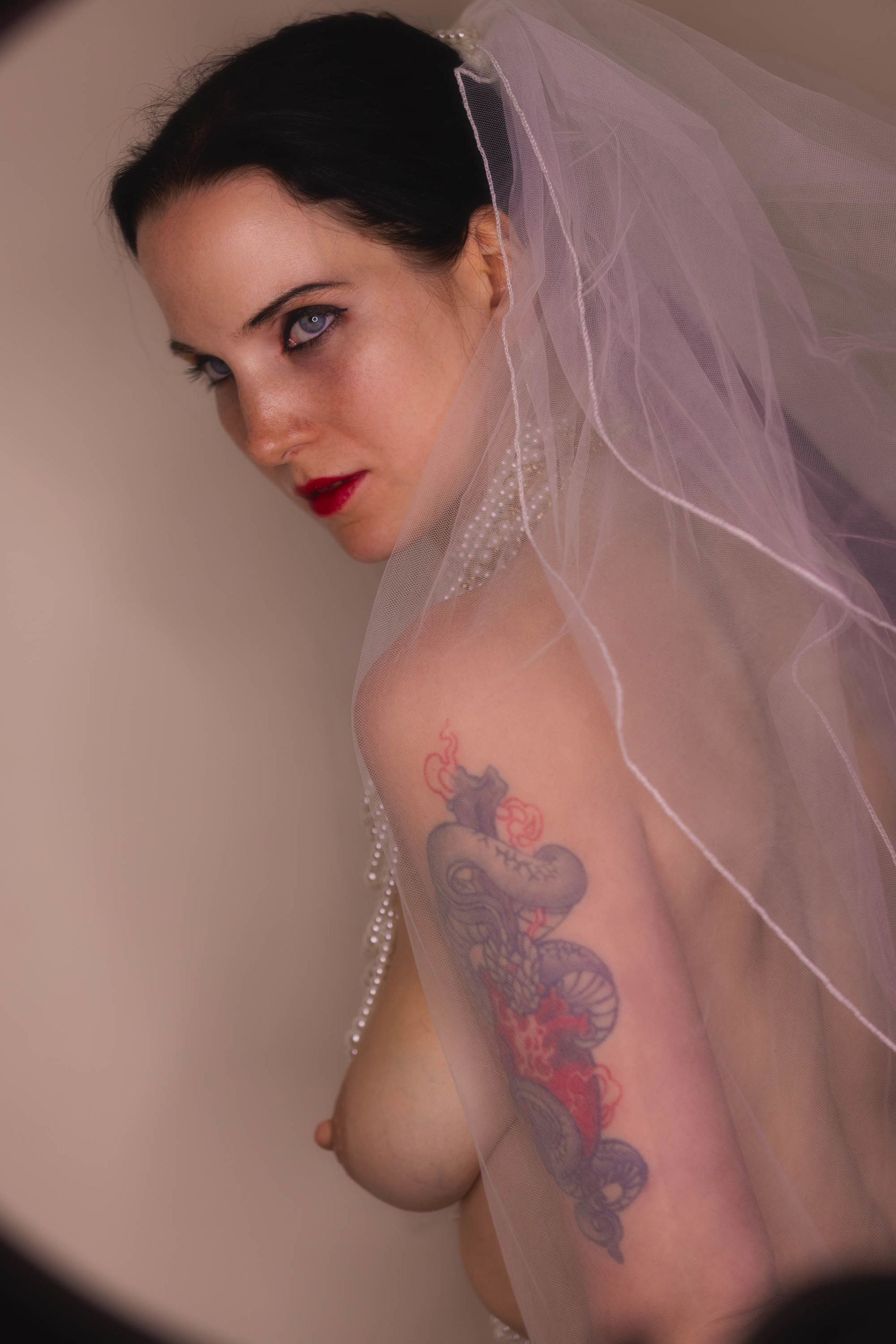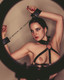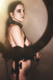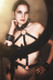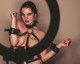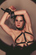 модель с тату и повисшими сисями. БДСМные кожаные наручники и сбруя создают новы образ
