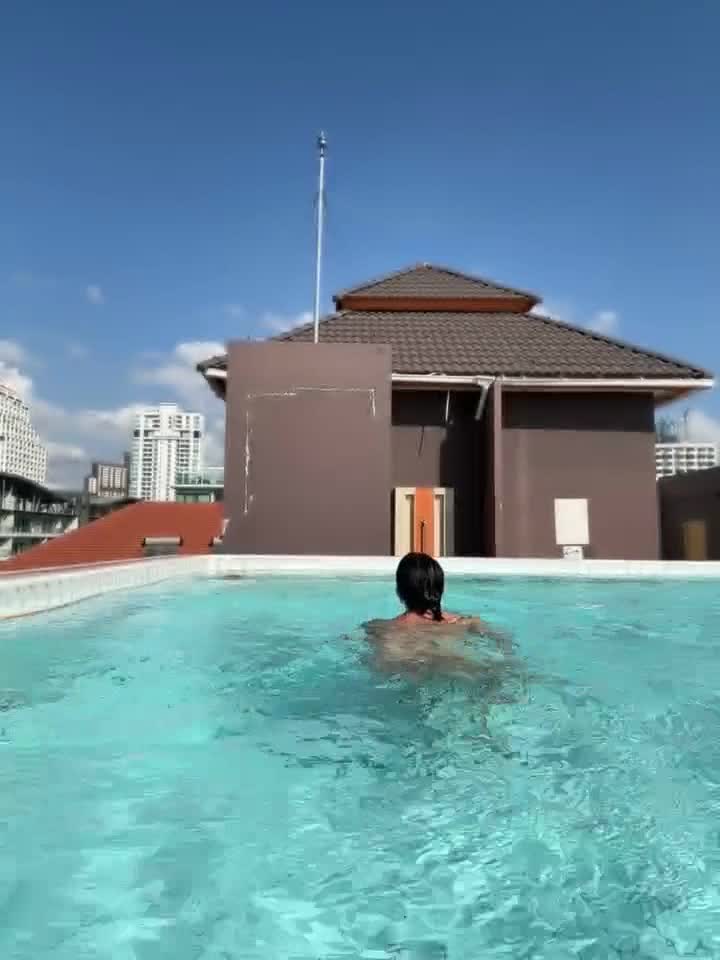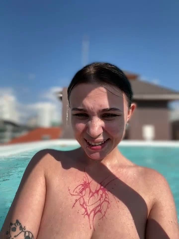 Девушка ходит и плавает в бассейне совершенно обнаженной.