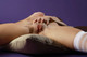 Фотосессия в фиолетовой студии. Модель позирует в откровенных позах.