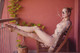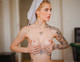 Красивая девушка с многочисленными татуировками, самая яркая из которых — стрекоза на животе.