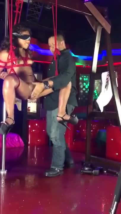 Девушка висит на ремнях, а её влагалище заполнено пневматическим молотком.