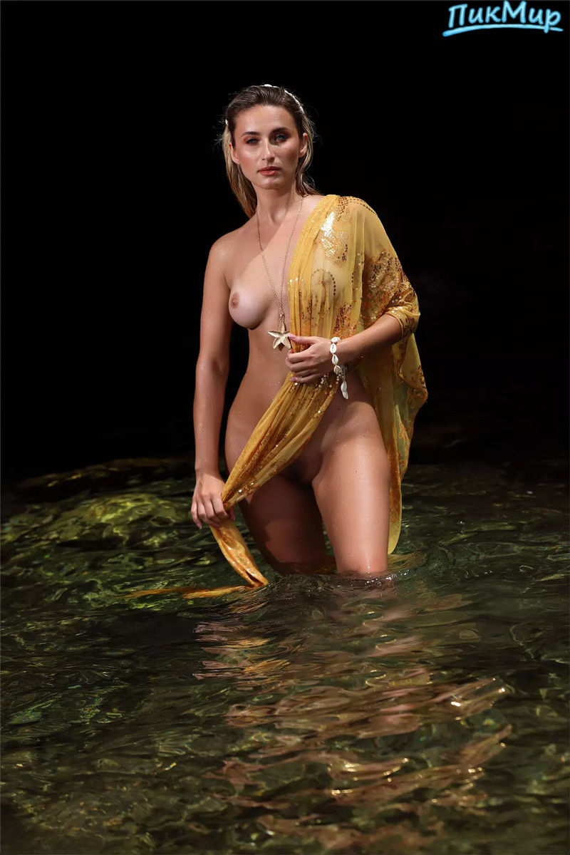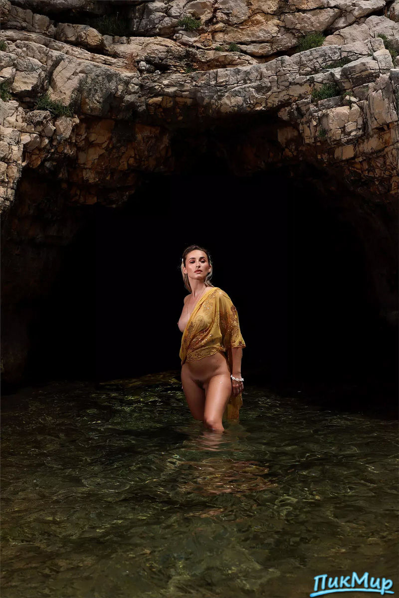 Привлекательная девушка-модель позирует у входа в морской грот.