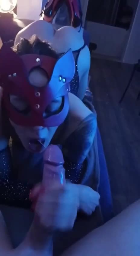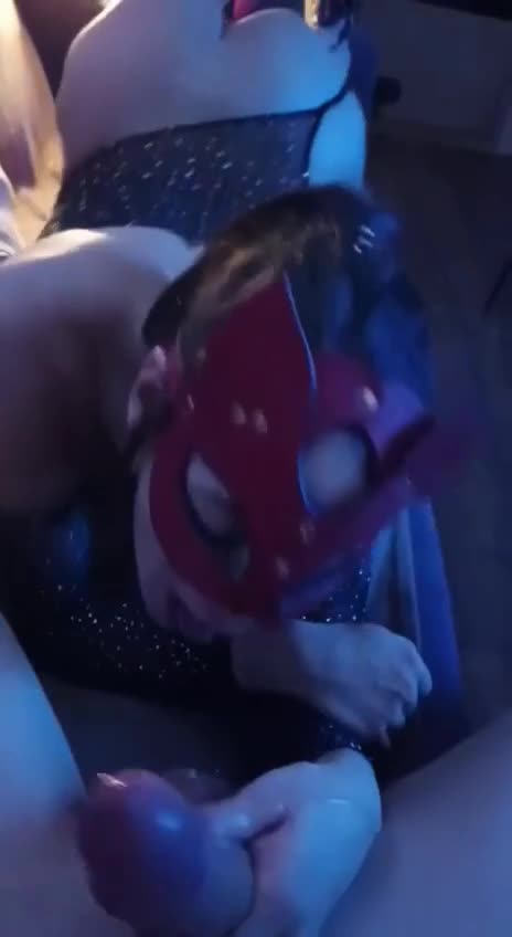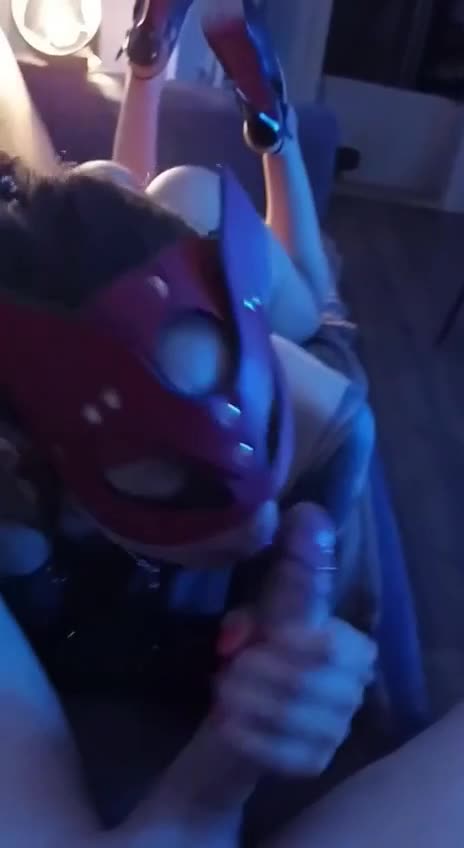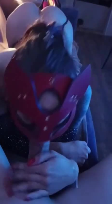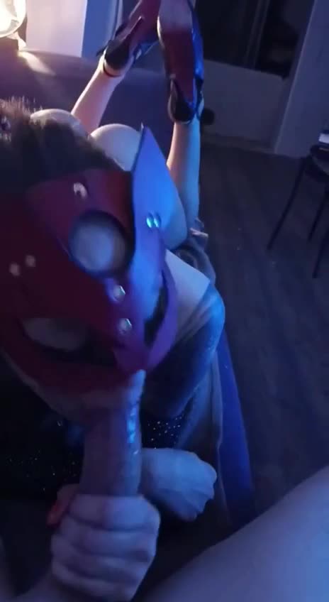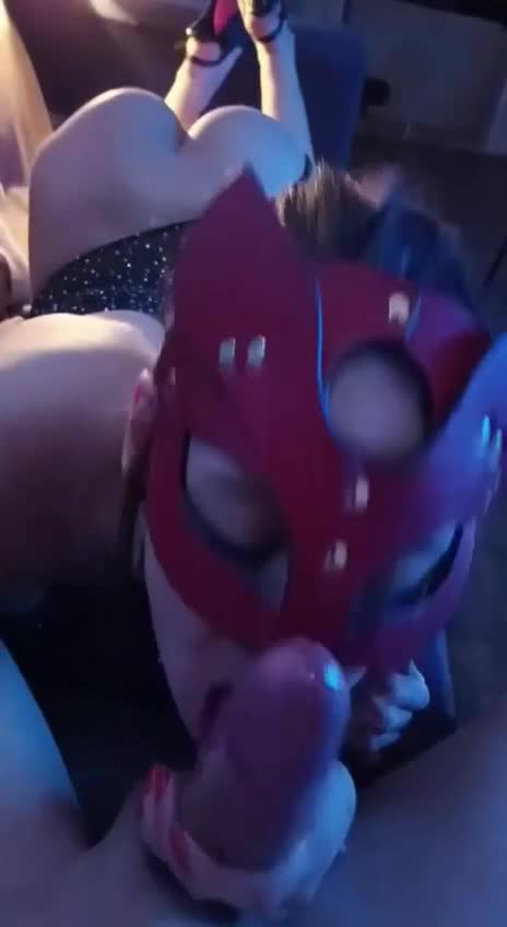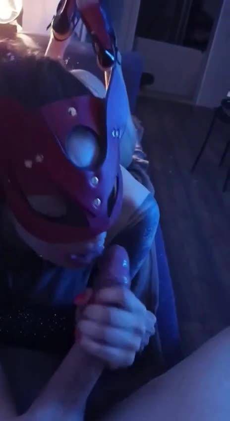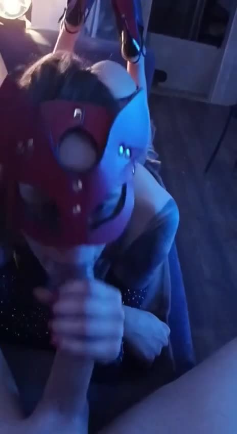 Шлюшка в маске с удовольствием и причмокиванием отсасывает длинный член