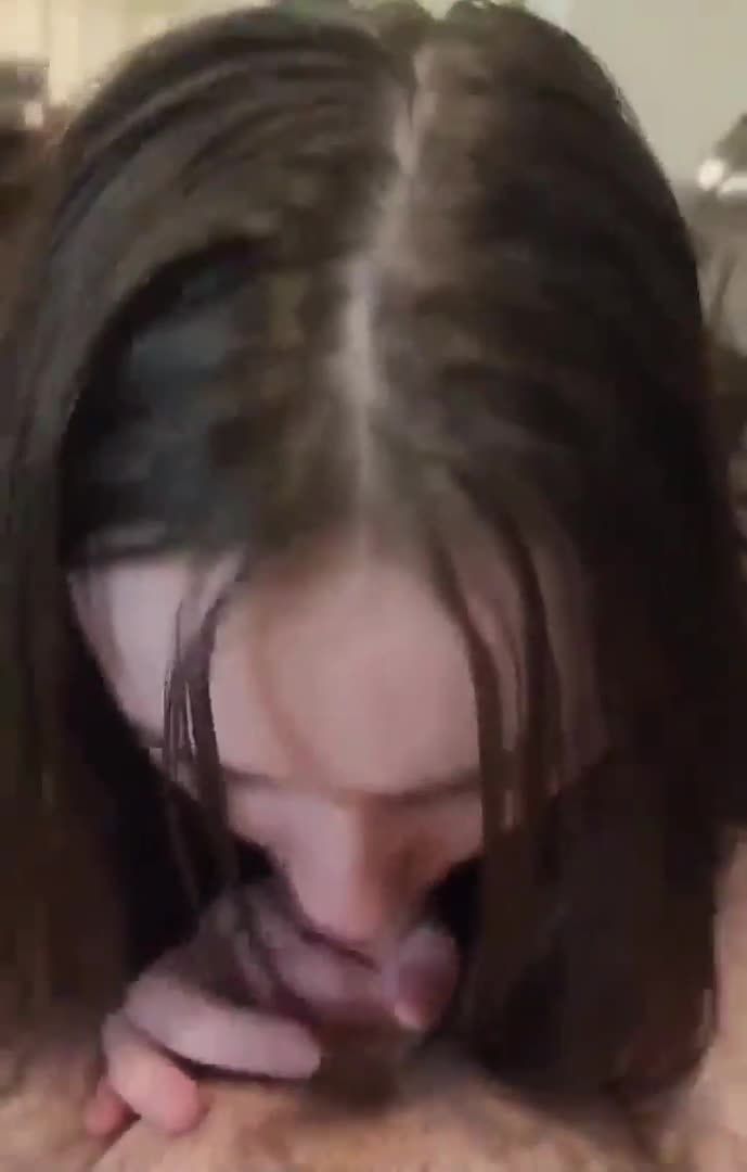 Девушка с невинными глазами осторожно, но застенчиво ласкает член парня ртом.