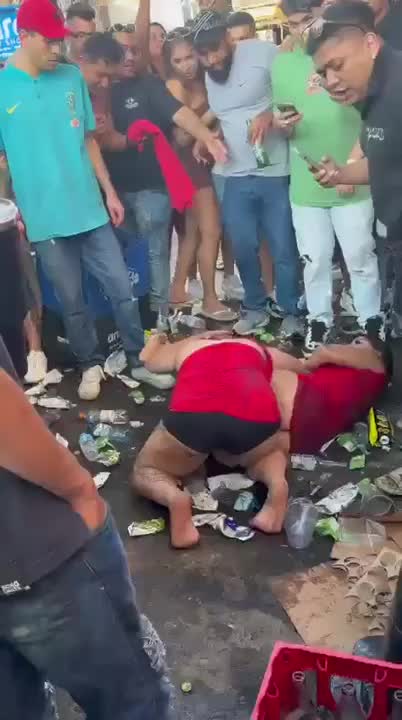 Девочки дерутся среди мусора, а мальчики заключают пари о том, кто победит.