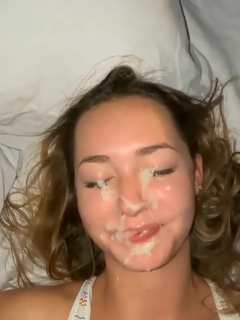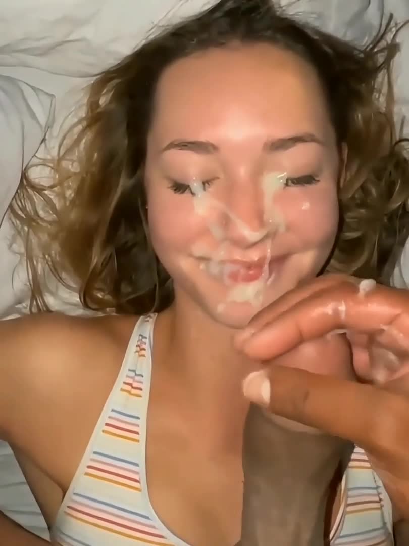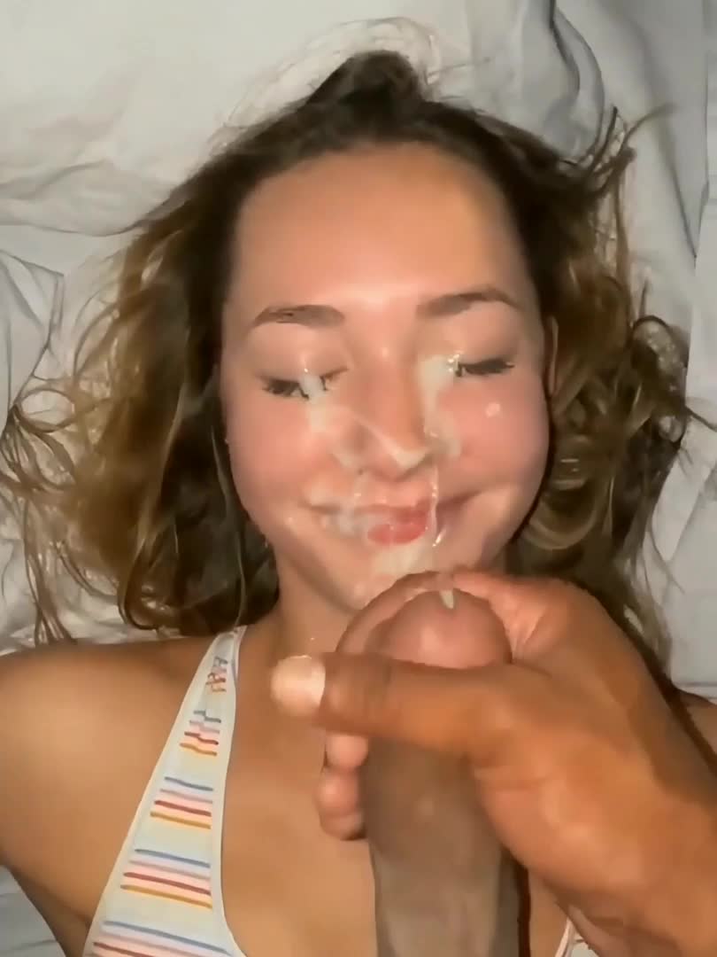 Молодая девушка получила обильную порцию спермы на лицо от большого члена.