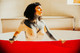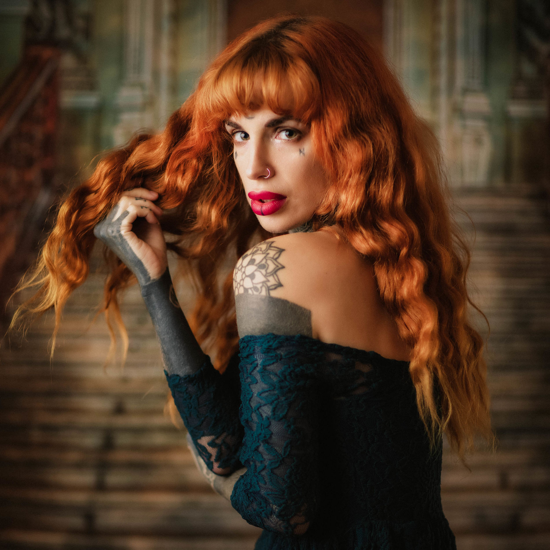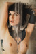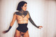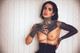 Необычная модель с декольте и рукой, покрытыми выразительной татуировкой.