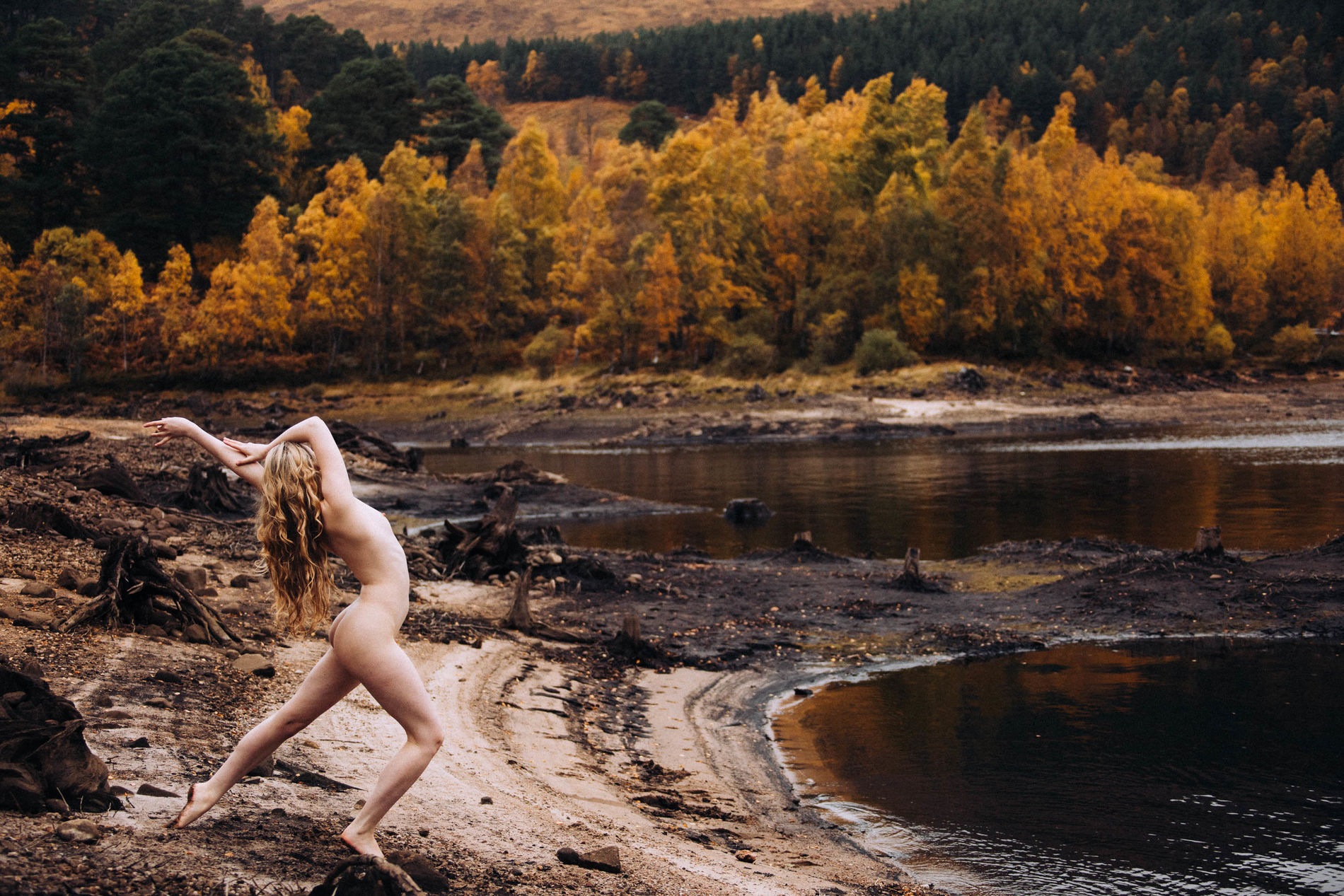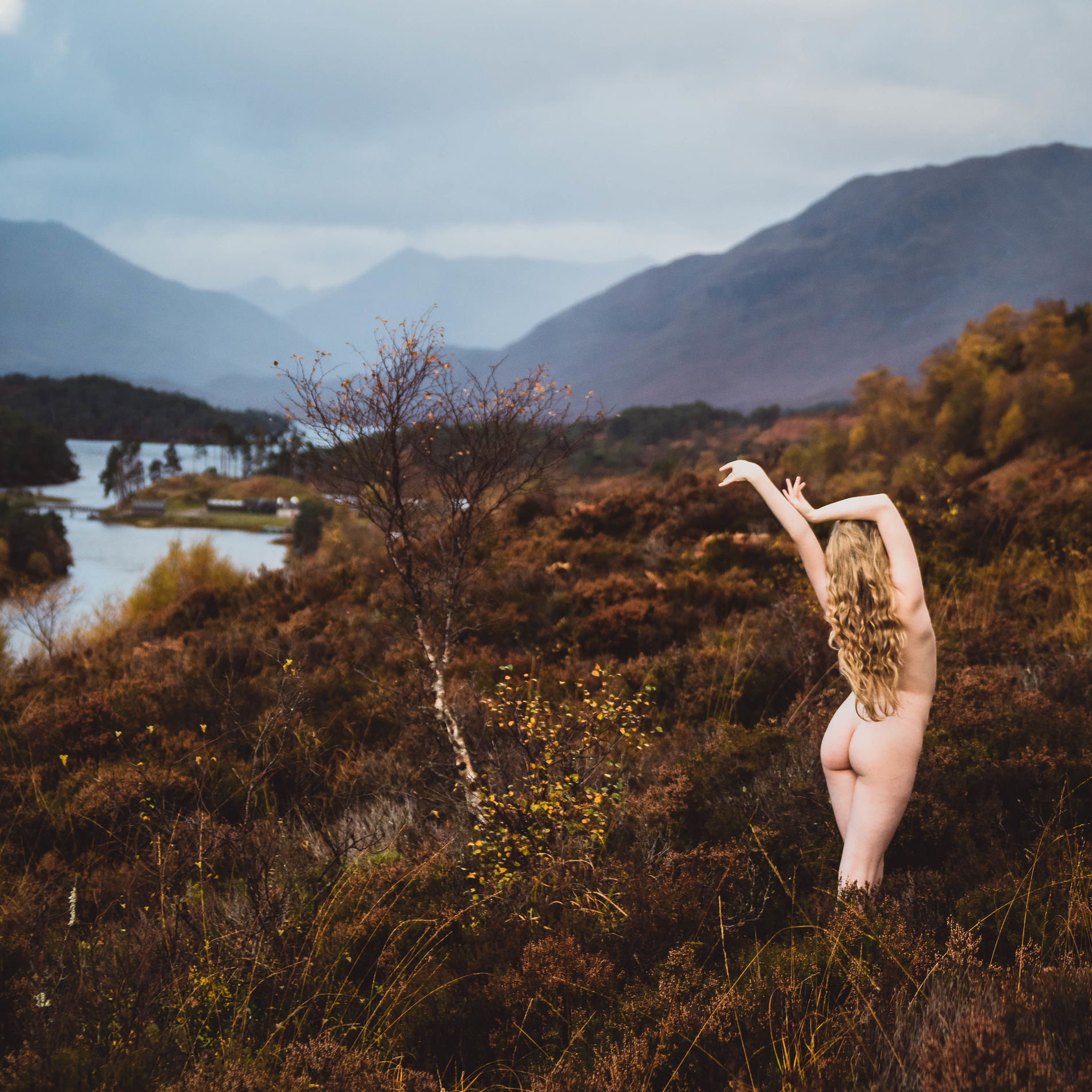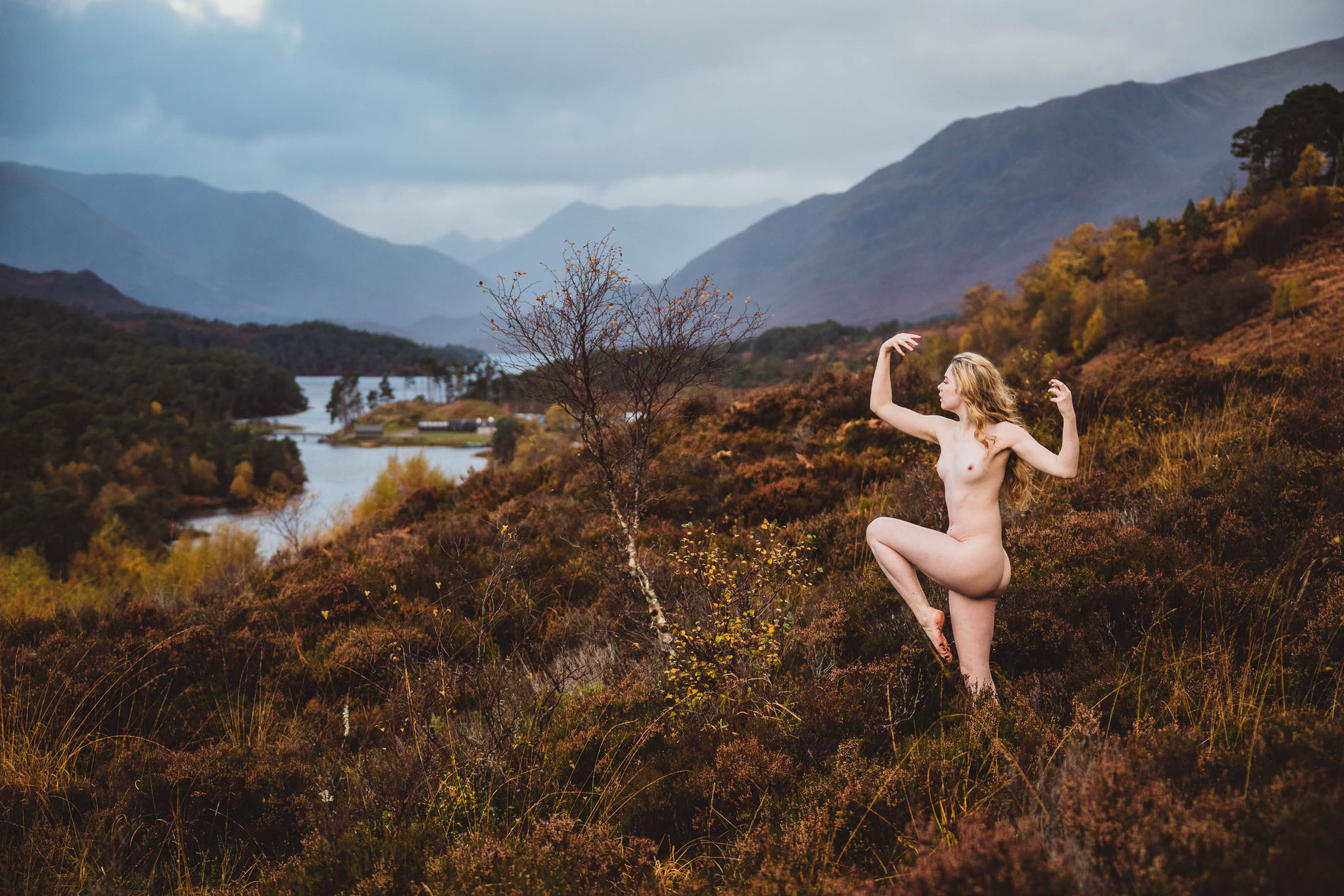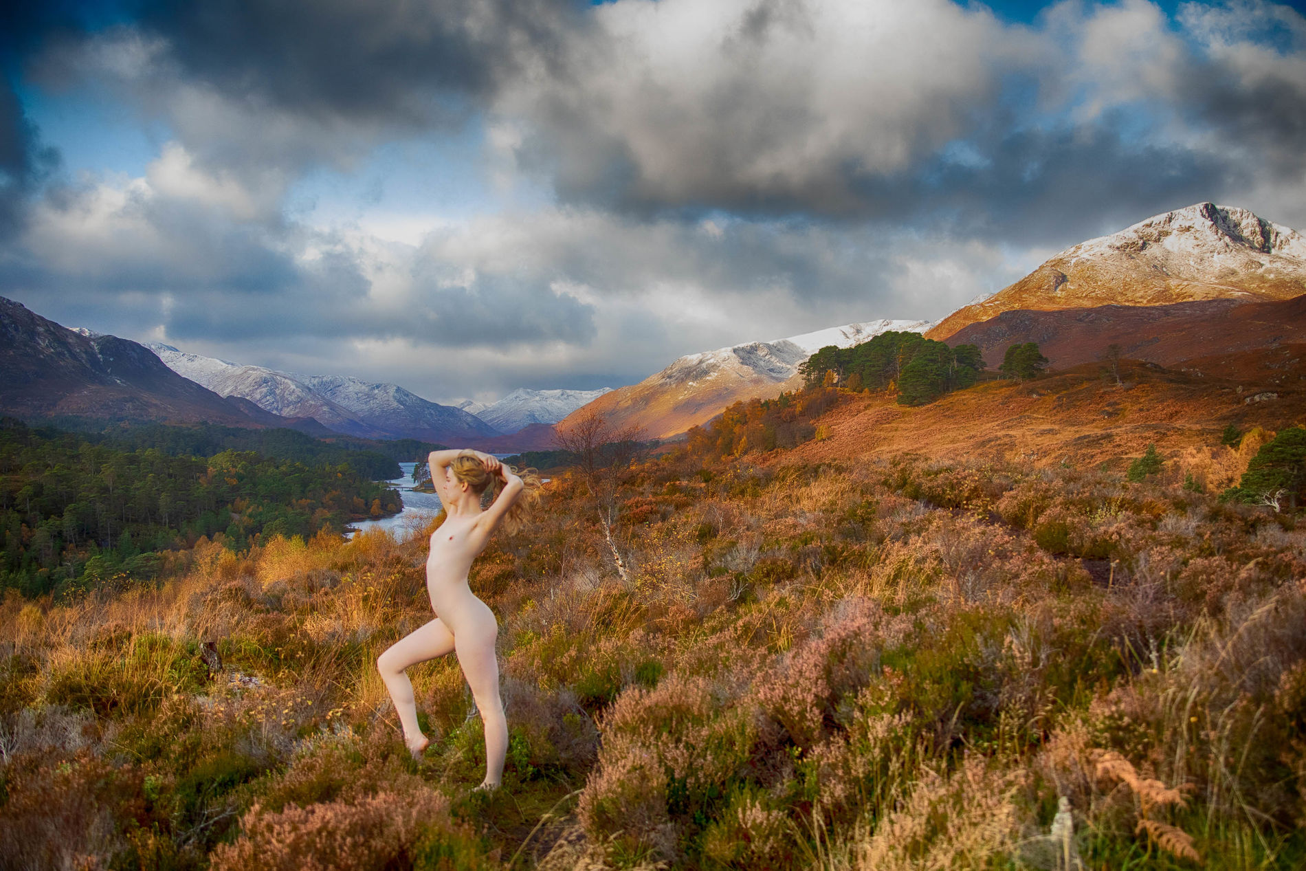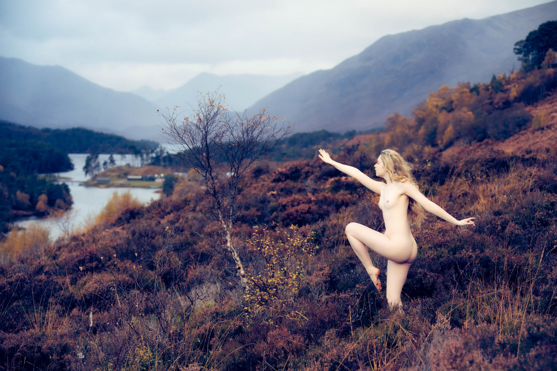 Блондинка среди ветреных холмов Шотландии