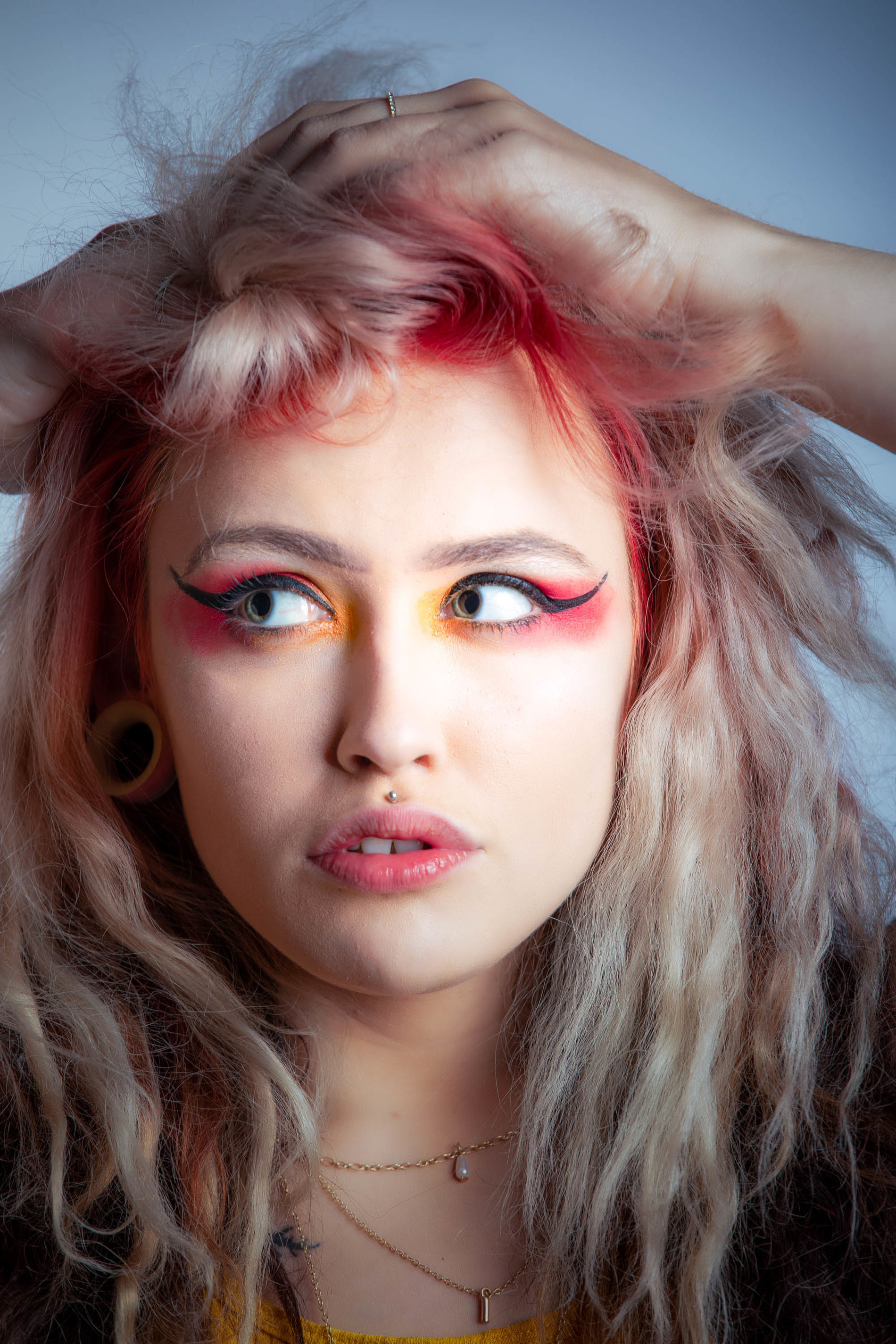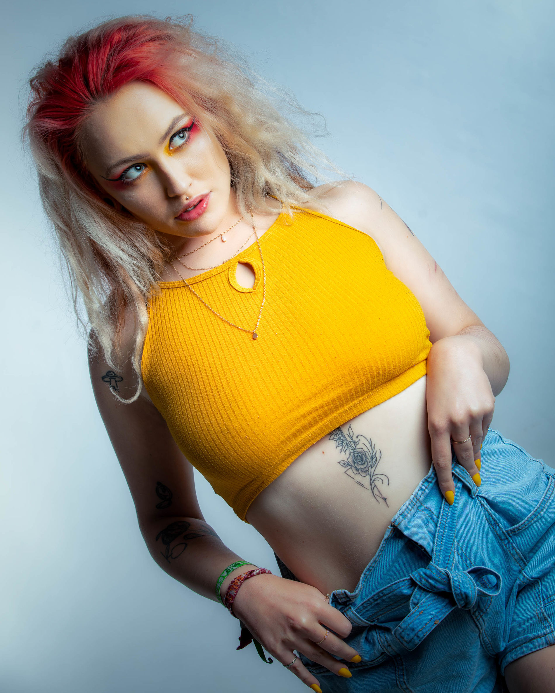 Несколько пирсингов, пара татуировок, разноцветные волосы и красивая грудь.