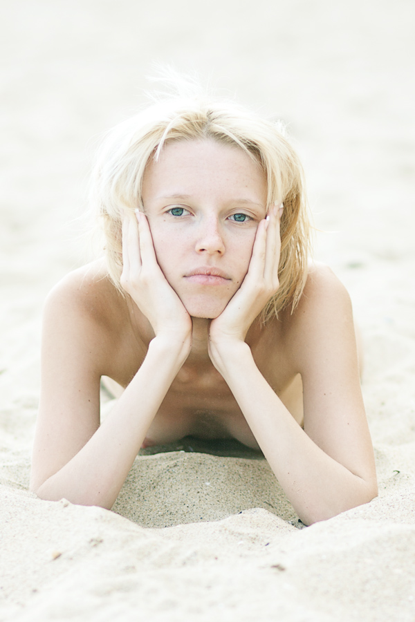 Молодая блондинка позирует на пляже.