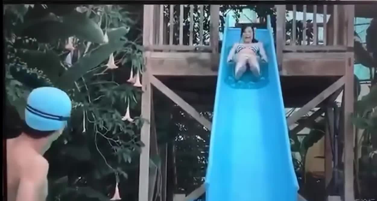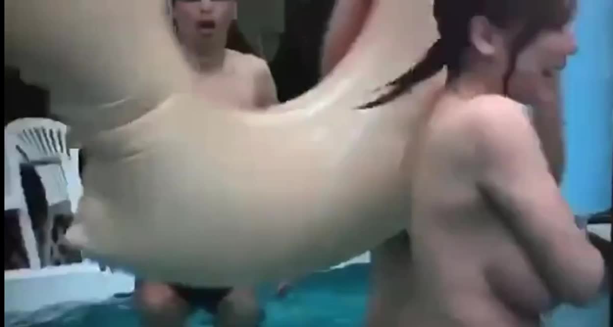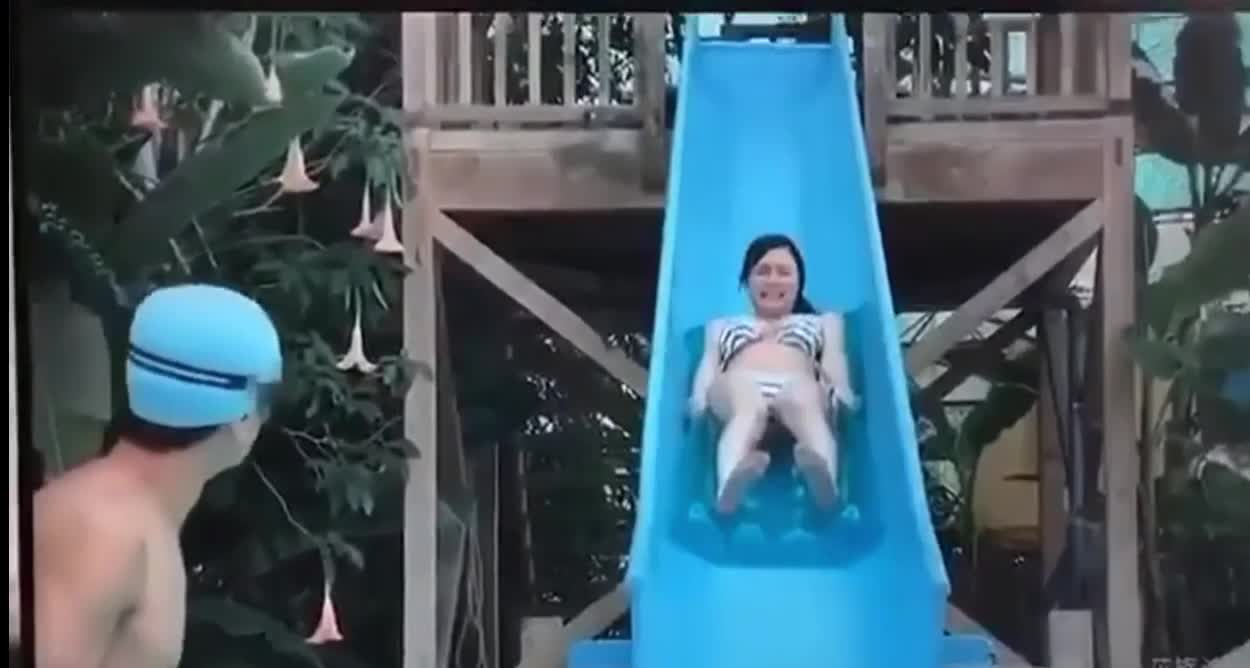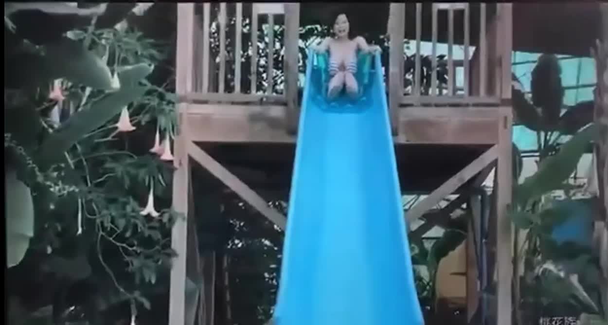 Весёлая японская девушка спускается с водной горки, и верхняя часть её купальника спадает, обнажая её очень большую грудь, но сама девушка не спешит прятаться.