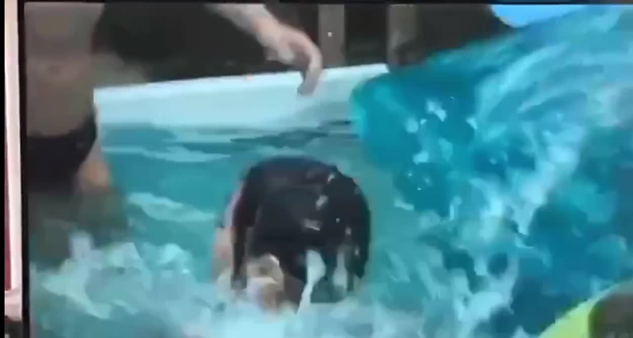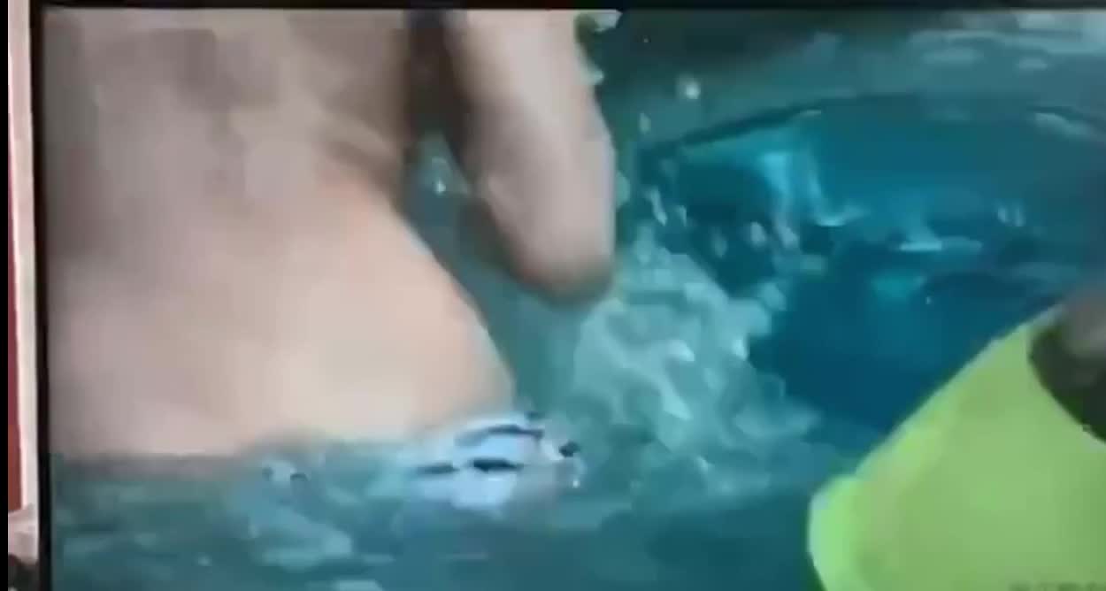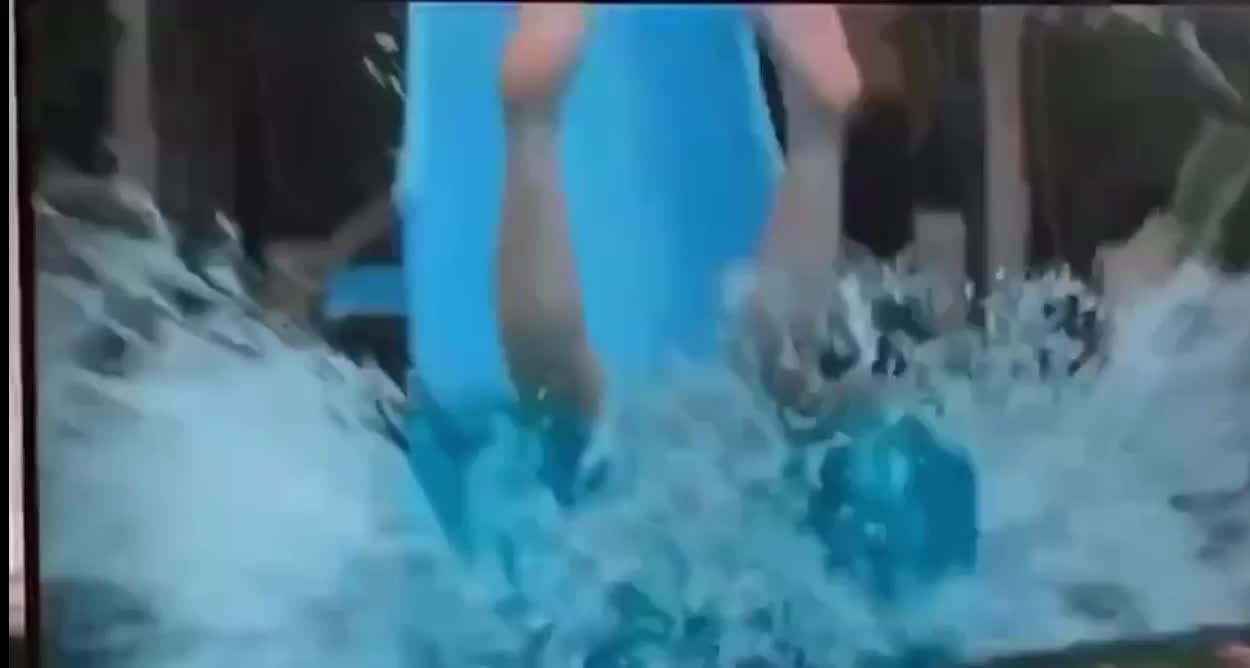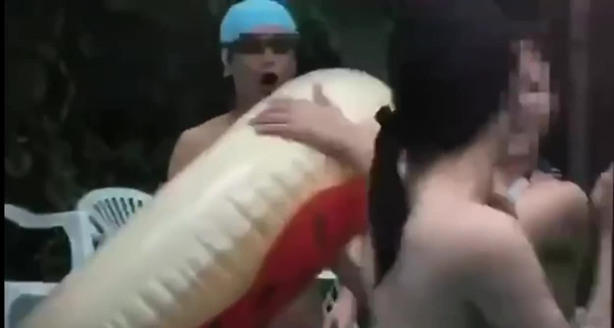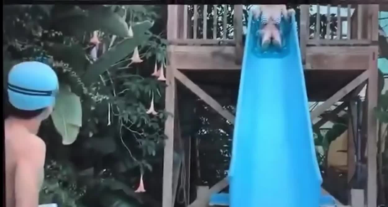 Весёлая японская девушка спускается с водной горки, и верхняя часть её купальника спадает, обнажая её очень большую грудь, но сама девушка не спешит прятаться.
