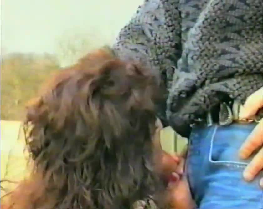 Женщина делает минет парню в джинсах. Ветрено.